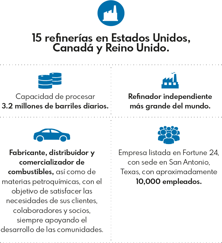 Valero Energy Corporation , con sede en San Antonio Texas, es un fabricante y proveedor internacional de combustibles y productos petroquímicos con capacidad de procesar más de 3.1 millones de barriles de materia prima diariamente; lo que lo convierte en el refinador independiente más grande del mundo con 15 refinerías en Estados Unidos, Canadá y Reino Unido y en el segundo productor más grande del mundo de diésel renovable y etanol a nivel mundial, ofreciendo así combustibles de clase mundial.